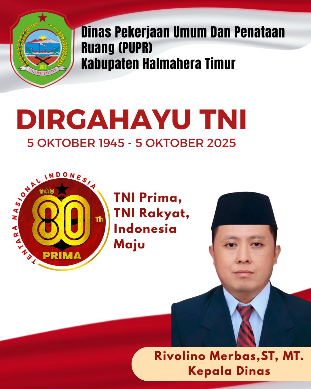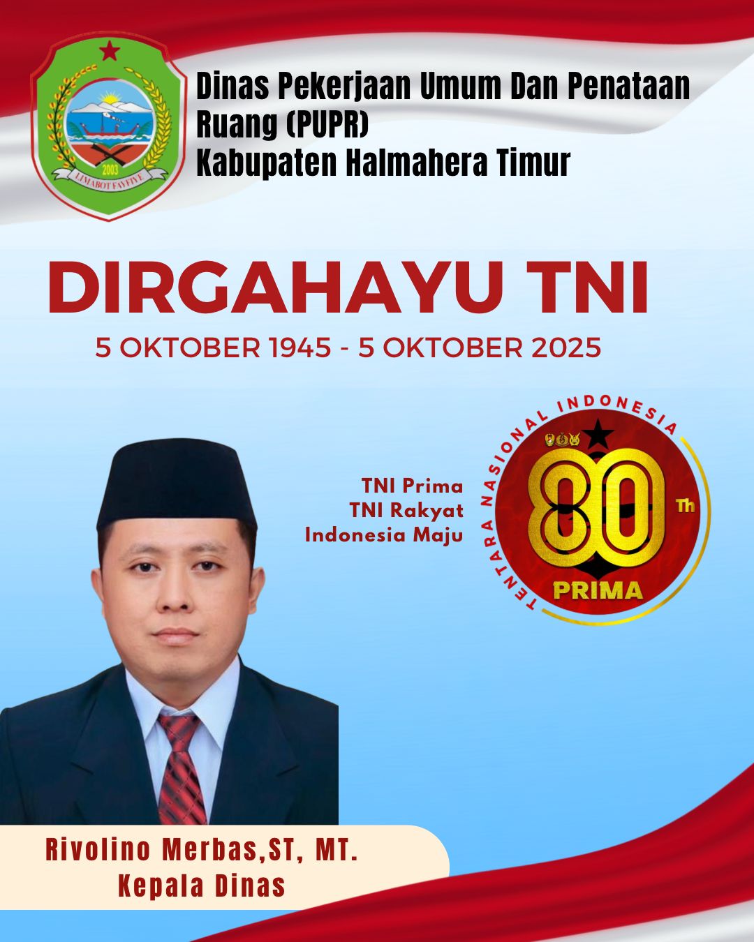HALTIMTV.COM – Kepala Dinas Pekerjaan Umum Dan Penataan Ruang (PUPR) Kabupaten Halmahera Timur, Beserta Seluruh Jajaran, Mengucapkan DIRGAHAYU TNI, Tanggal 5 Oktober 2025.