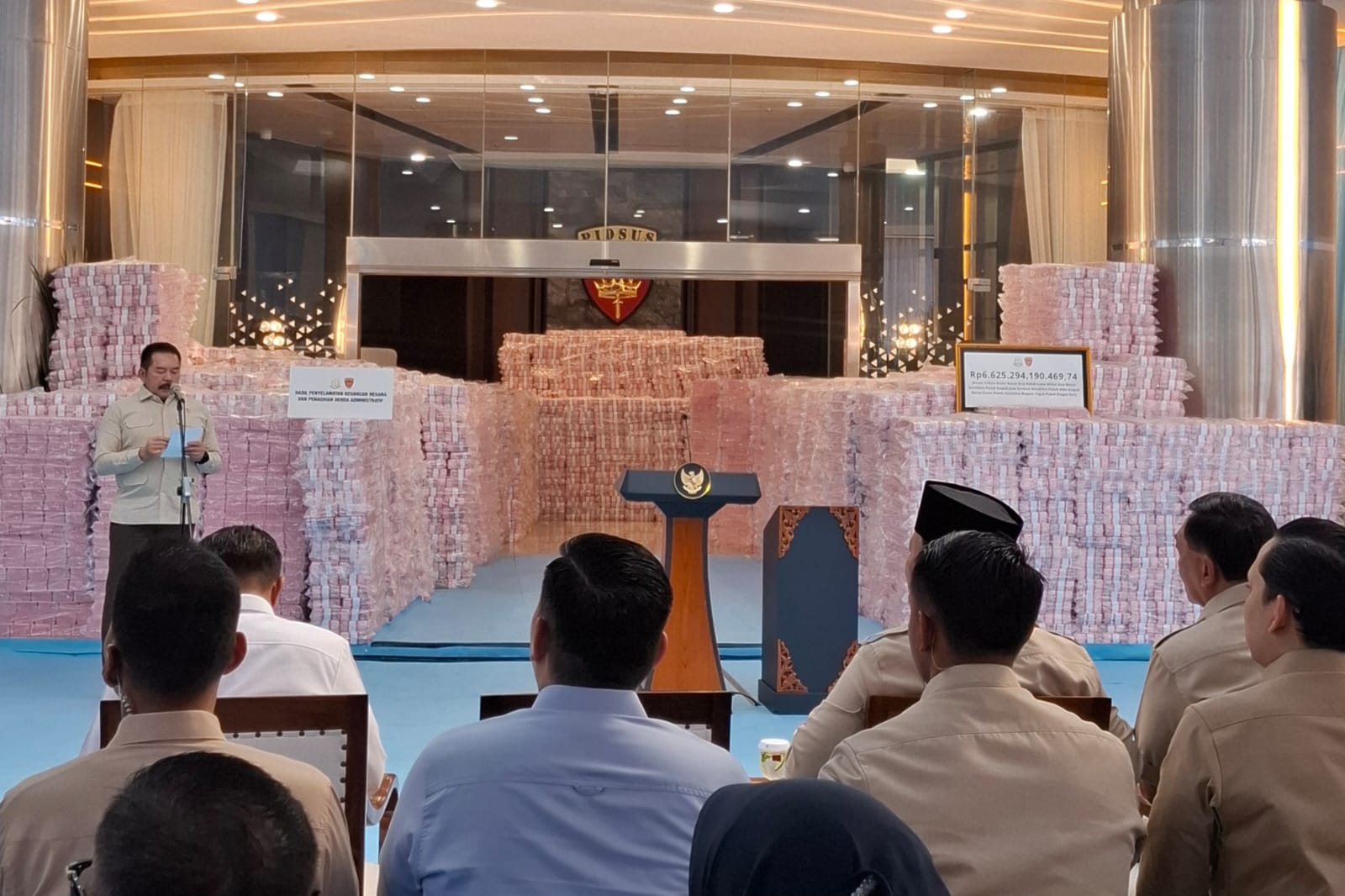 Penyeraahan berlansgung di Gedung Bundar Kejaksaan Agung, disaksikan langsung Presiden Prabowo Subianto.