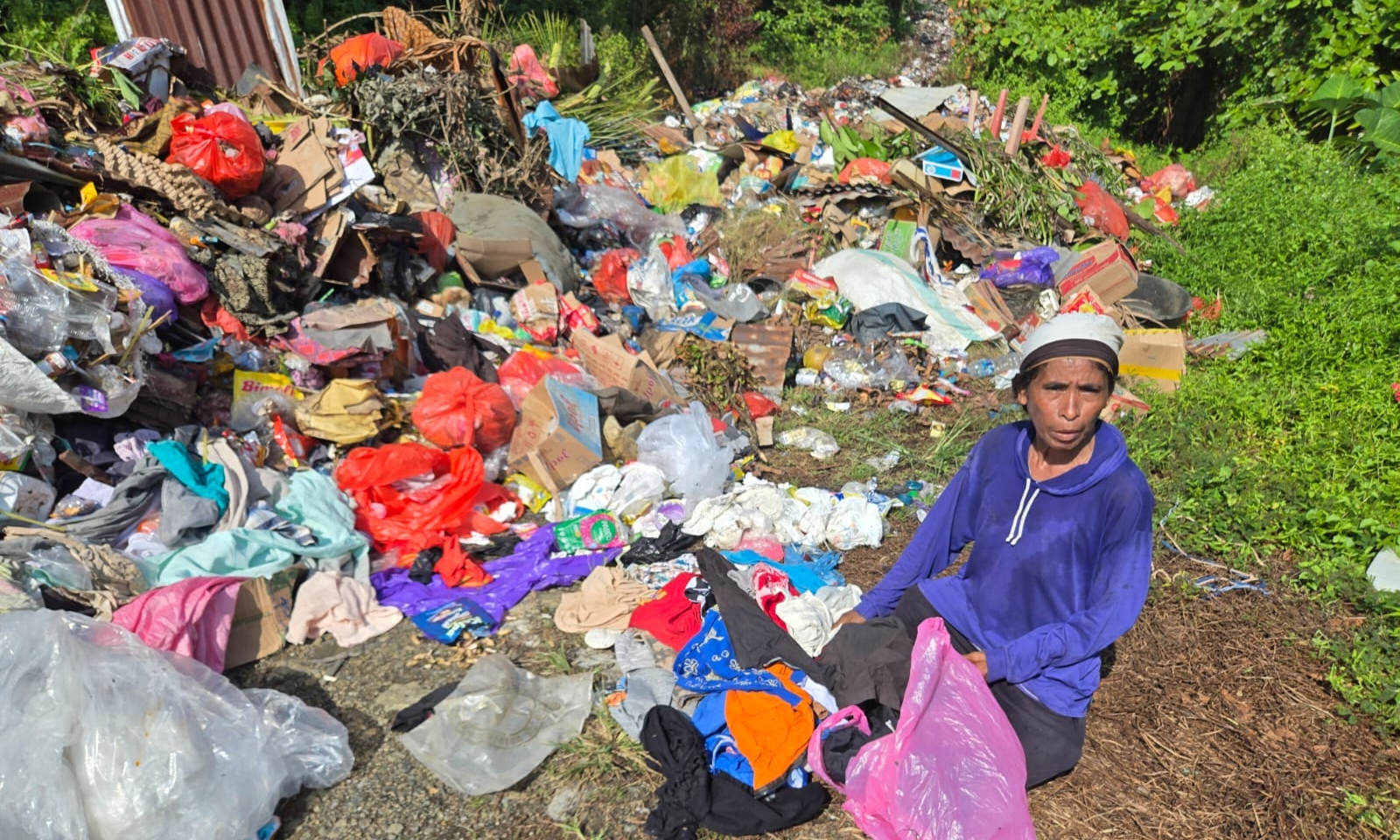 Saat itu pertengahan Oktober 2025, tumpukan sampah terlihat menumpuk di luar area dumping point Tempat Pembuangan Sementara (TPS) Buli.
